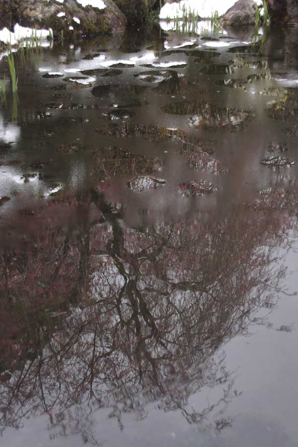 | 池に映る桜 | 薄氷が張った池に桜が映る | 融けた氷の合間にピンクの桜 | 枝に雪が積もった梅 |