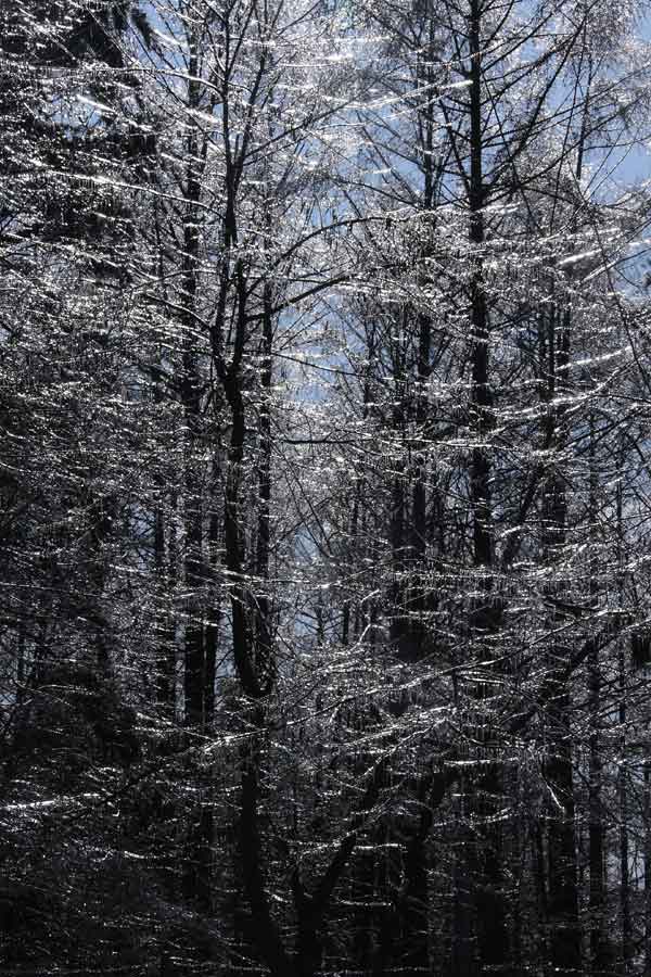 松本南アルプス公園 林一面、日光に輝く雨氷 |