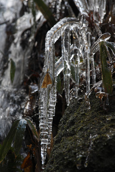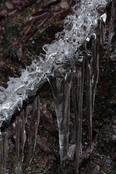 | 猫に見える氷の空洞 | 下の葉の形が空洞となり光輝く | 枯れ枝に流れる水が凍って出来たツララ | 破裂した水パイプからの飛沫が凍りついた木の枝 |