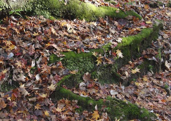| 苔むした欄干に映えるモミジ | 苔むした根に積もる落ち葉 | 西日に映える黄葉 | 小さな滝? |