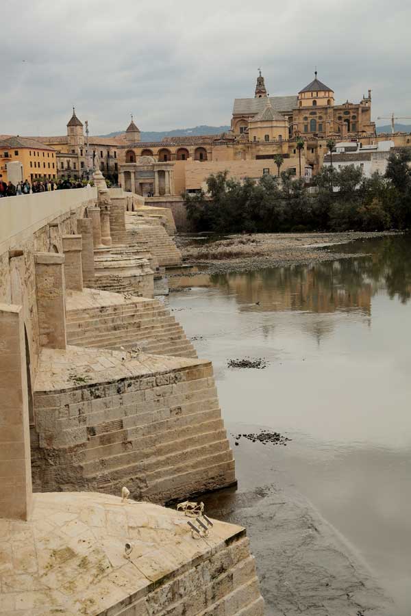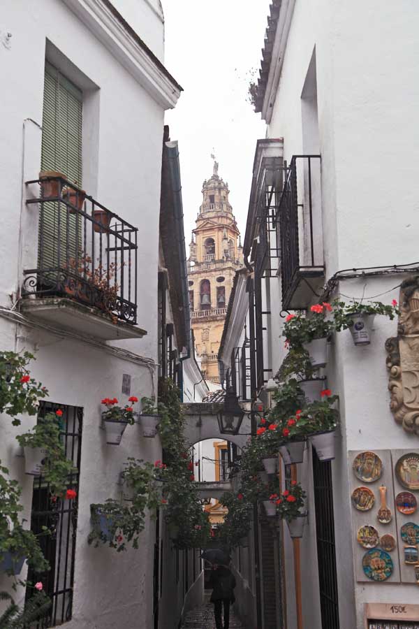 | 川の対岸からメスキータ(礼拝堂)を撮る | 旧ユダヤ人街 飲食店・みやげもの屋が並ぶ白壁の家 |